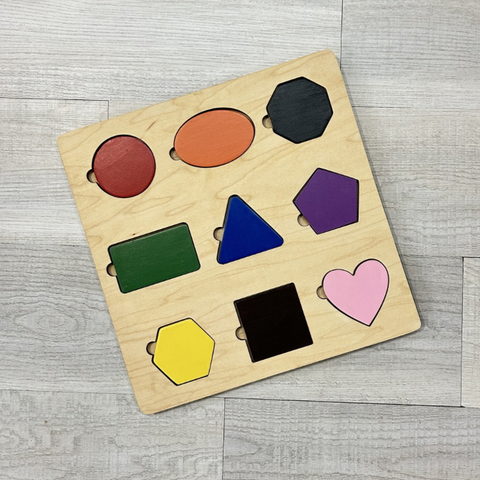 Peekaboo Puzzles – 9 shapes (you choose the colours) Acrylic slide outs are included (to adhere the pictures to) as well as a Canva file (free version with instructions) that you can use to drag and drop your pictures into the shapes and print them any time you’d like to make changes.